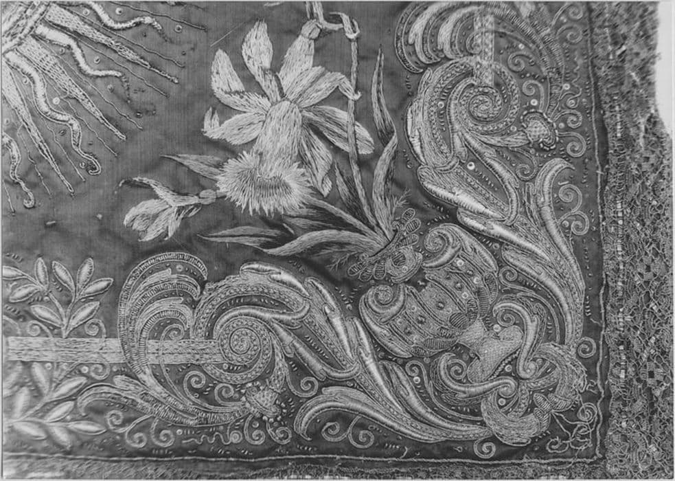 soie : brodé ; fil ; fil métal : doré, argenté ; dentelle au fuseau