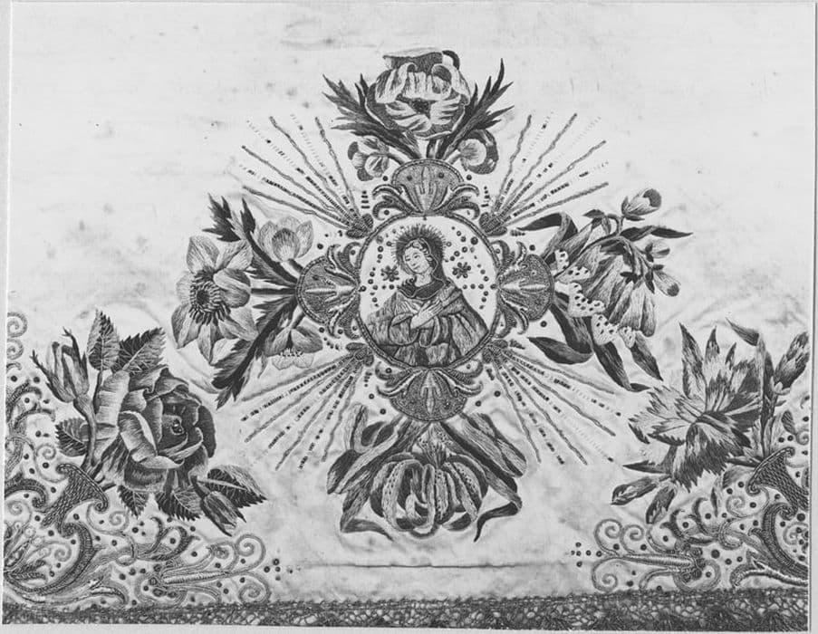 Un médaillon, au centre duquel est brodé un buste de la Vierge, se détache sur une croix composée de motifs floraux. Dans les angles inférieurs du voile, deux bouquets de fleurs. Sur un tissu de soie, broderies de soie exécutées au point passé empiétant. Rehauts de cannetille. Dentelle d'or au fuseau sur le pourtour.