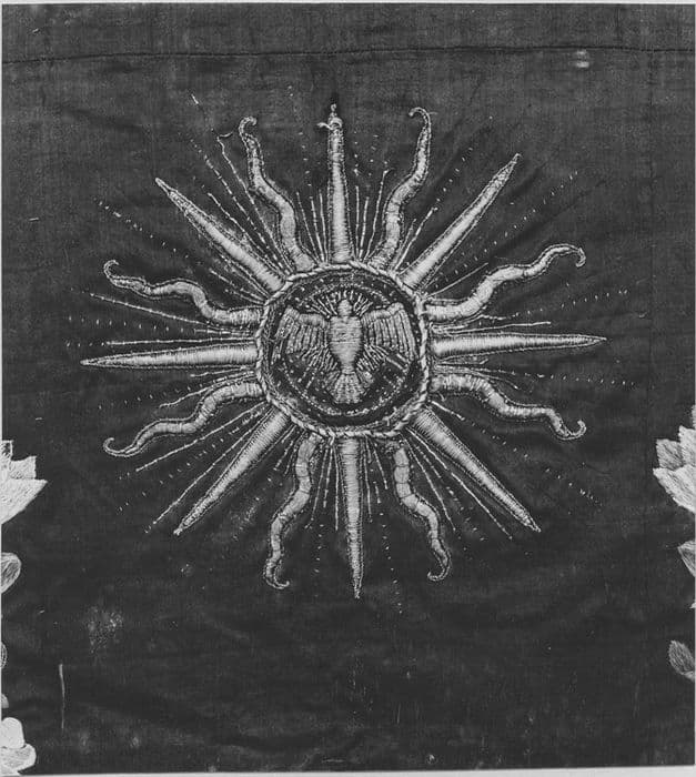 Au centre du voile, une colombe, symbole du Saint Esprit, se détache sur un motif rayonnant. Un encadrement de guirlandes et d'arabesques entoure le voile en reliant les angles qui sont ornés de vases remplis de fleurs. Sur un tissu de soie, les fleurs sont brodées avec des fils de soie au passé empiétant. L'oiseau, les rayons, les vases et les guirlandes sont en rehauts de cannetille au fil d'or et d'argent.