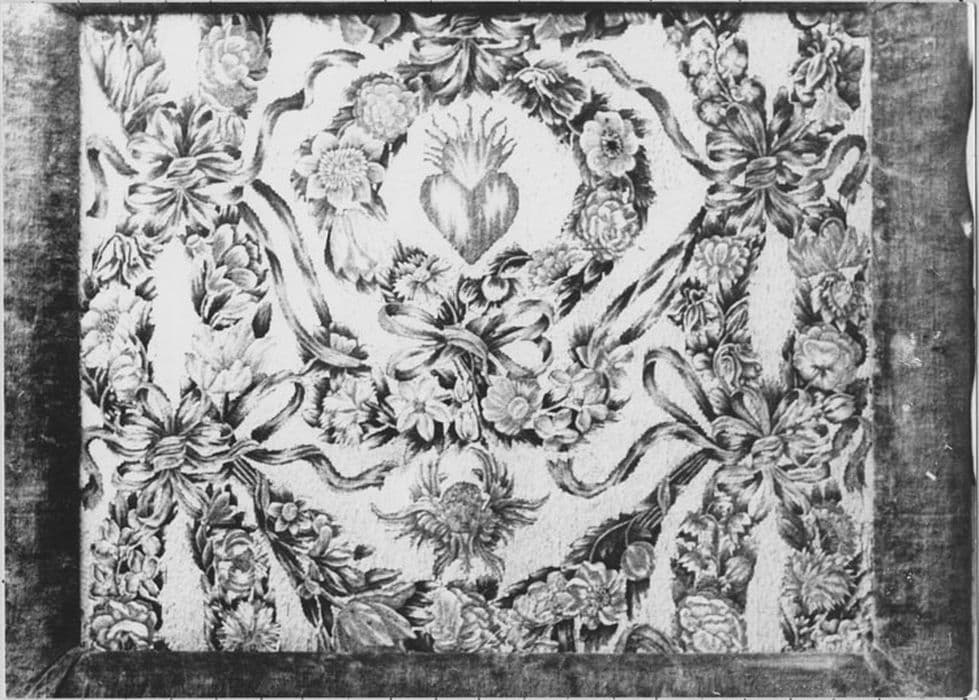 Antependium ou décor mural présentant deux guirlandes de fleurs tressées, parallèles, nouées par des rubans. Dans la partie centrale supérieure est représenté un coeur enflammé, attribut de saint Augustin. Broderie de soies polychromes essentiellement brodée de laines et de soies au passé empiétant.