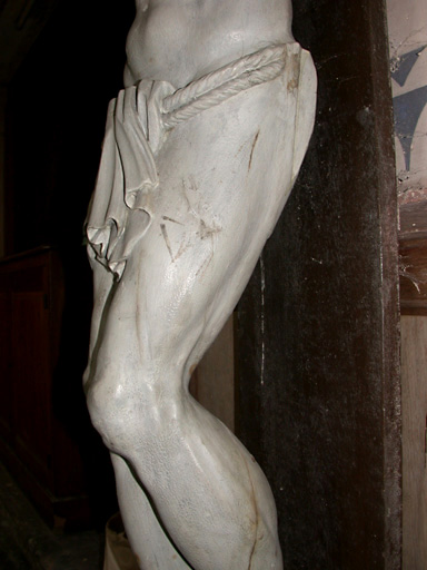 Christ en croix en bois sculpté ; le Christ est peint en blanc. Il lui manque des doigts.