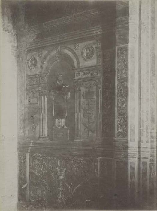 figures bibliques (Apôtre : saint Jacques le Majeur, saint Jacques le Mineur, saint Jean, saint Matthias, saint Matthieu, saint Philippe, saint Simon, saint Thomas) ; figures bibliques (petit prophète : Aggée, Habacuc, Jonas, Michée, Zacharie) ; figures bibliques (grand prophète : Daniel, Ezéchiel) ; figures bibliques (homme de l'Ancien Testament : Adam, Eléazar, Job, Patriarche) ; figure biblique (Eve) ; figures (saint Ambroise, saint Antoine, saint Augustin, saint Christophe, saint Grégoire, saint Jean l'Evangéliste, saint Jérôme, saint Joseph, saint Louis, saint Martial, saint Martin, saint Michel, saint Roch, saint Salvy, saint Sébastien, saint Silvestre, saint Urbain, saint Valérien) ; figures (sainte Agathe, sainte Agnès, sainte Anastasie, sainte Apolline, sainte Barbe, sainte Catherine, sainte Catherine de Sienne, sainte Cécile, sainte Claire, sainte Madeleine, sainte Marie l'Egyptienne, sainte Marguerite, sainte Marthe, sainte Suzanne, sainte Ursule, sainte Véronique) ; figure biblique (roi d'Israël : Joachim) ; scène biblique (Couronnement de la Vierge, Transfiguration, Apparition aux apôtres, Les vierges sages et les vierges folles) ; figure mythologique (Sibylle phrygienne, Sibylle libyque, Sibylle persique) ; ornementation (en fond, candélabre, rinceau)