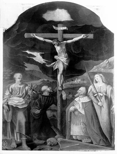 tableau : Christ en croix entouré de deux saints une sainte et un donateur