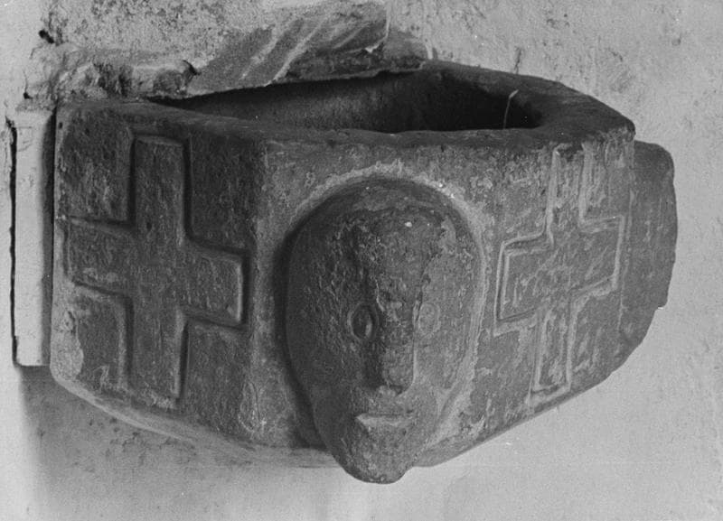 figure (homme : tête) ; figure (femme : tête) ; ornementation (croix grecque)