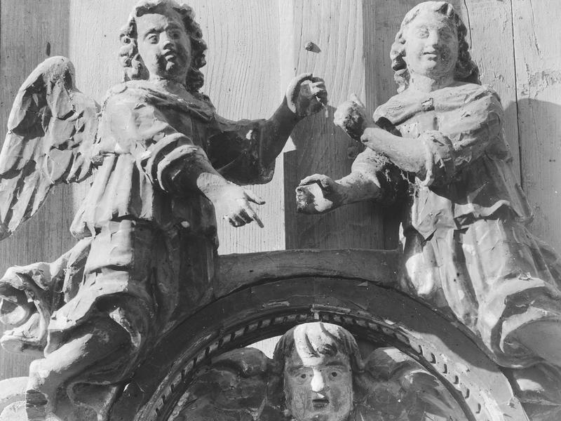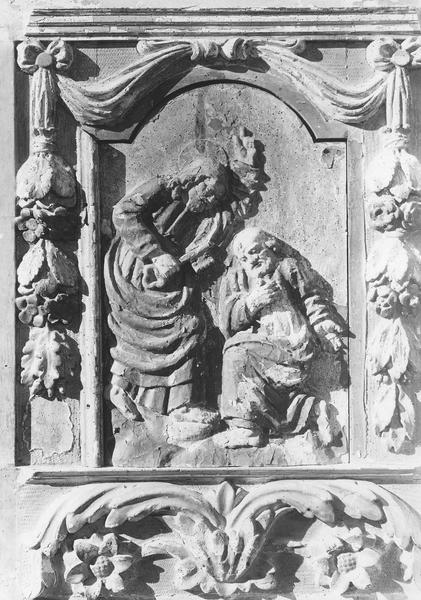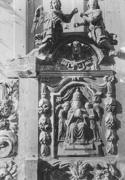 figure biblique (saint Pierre, Vierge à l'Enfant, Les Evangélistes, ange : portant, croix papale) ; scène biblique (Crucifixion) ; ornementation (angelot, pampre, ordre corinthien, chutes, feuille de laurier, rose, noeud, ruban, clé)