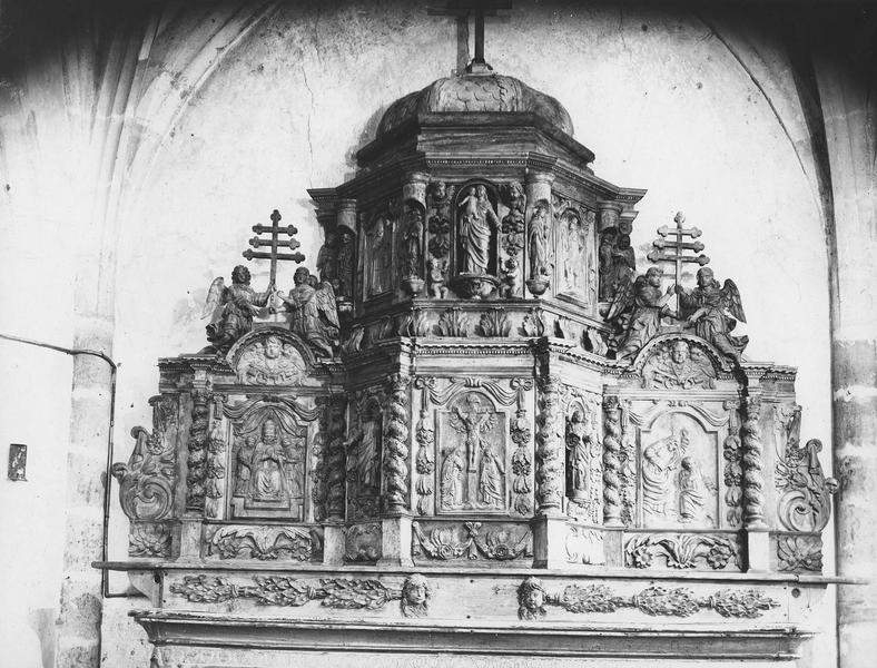 Tabernacle architecturé à ailes et à étage. L'étage inférieur comporte six colonnes torses, deux statuettes, deux scènes sculptées en bas-relief. A l'étage, 5 statuettes et deux bas-reliefs.