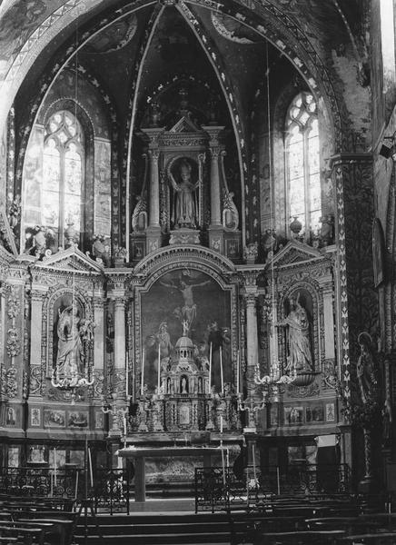Retable à cinq compartiments délimités par deux colonnes d'ordre corinthien cannelées aux deux tiers supérieurs et pamprées sur le tiers inférieur, et de huit pilastres de même décor. Au centre : toile (bord supérieur cintré) représentant la Crucifixion avec Marie, saint Jean et la Madeleine. Dans les deux premiers compartiments latéraux deux statues de saint Joseph et de la Vierge à l'Enfant, logées dans des niches. Les deux compartiments suivants, en retour sur les murs du choeur présentent deux tableaux, Résurrection du Christ et une Apparition du Christ. Couronnement : entablement, frontons et édicule à niche et fronton dans lequel est placée une statue de saint Salvy. Retable montrant une très riche ornementation.