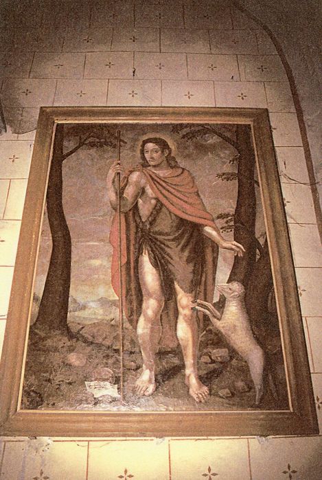 Le saint est debout appuyé sur une longue croix, jambes et côté droit nus, sur un fond de paysage pierreux, quelques troncs d'arbres à droite et à gauche. Il tend la main gauche vers un agneau.