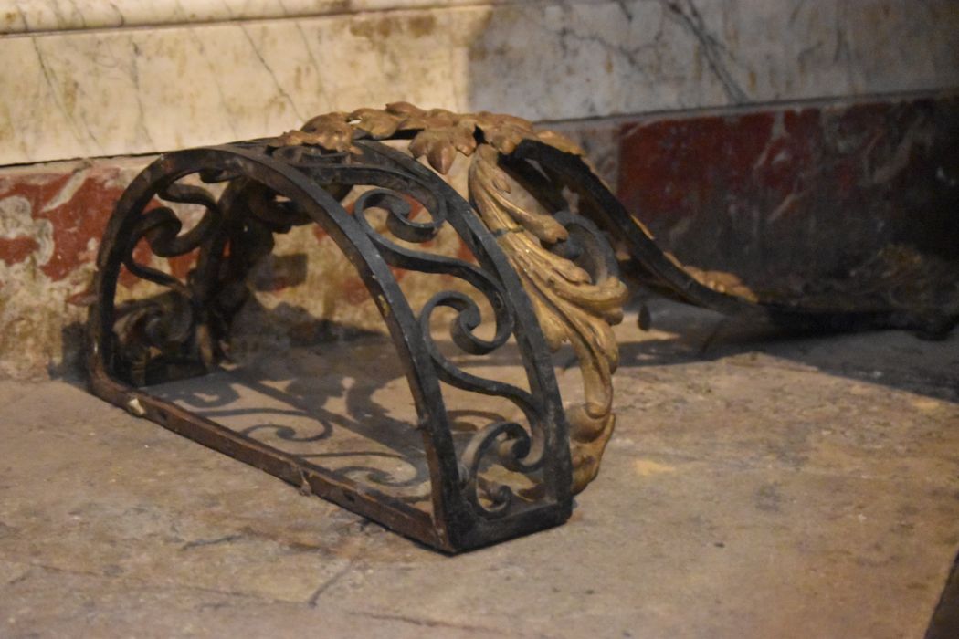 Deux consoles murales en fer forgé et doré, avec plateau en marbre gris.