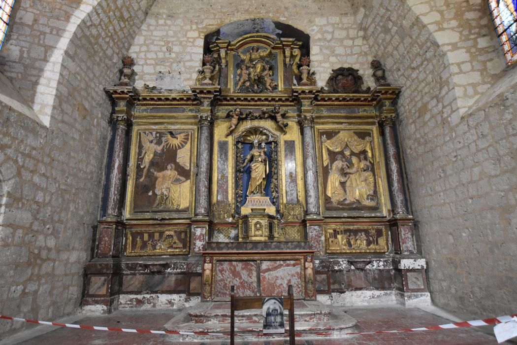 Retable composé de trois panneaux séparés par des colonnes corinthiennes.