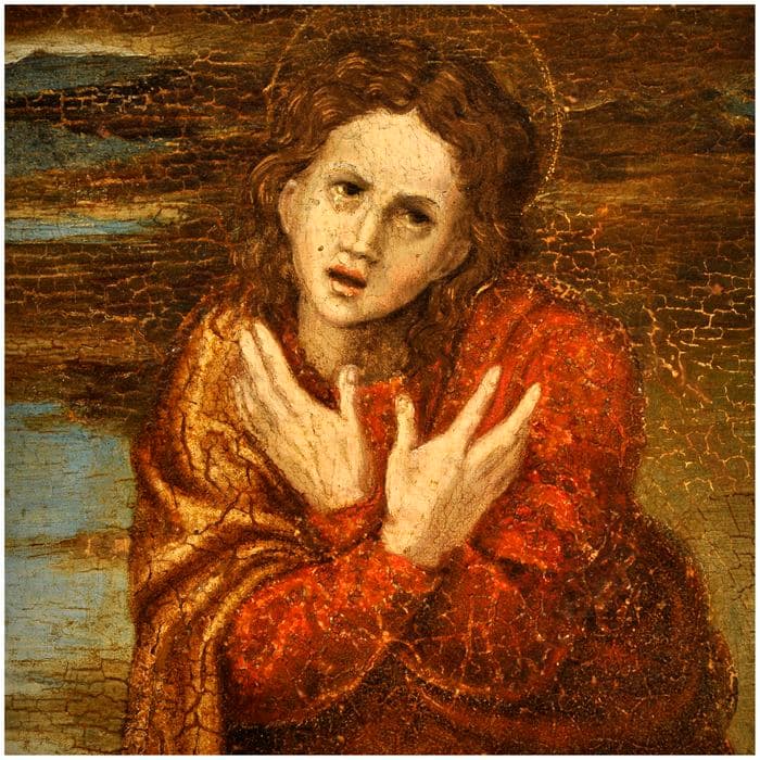 Christ en croix se détachant d'un ciel très nuageux. La Vierge au manteau bleu foncé, à gauche, saint Jean en vêtement brun à droite. On aperçoit un paysage de montagne et la ville de Jérusalem dans le fond. Au pied de la croix un crâne.