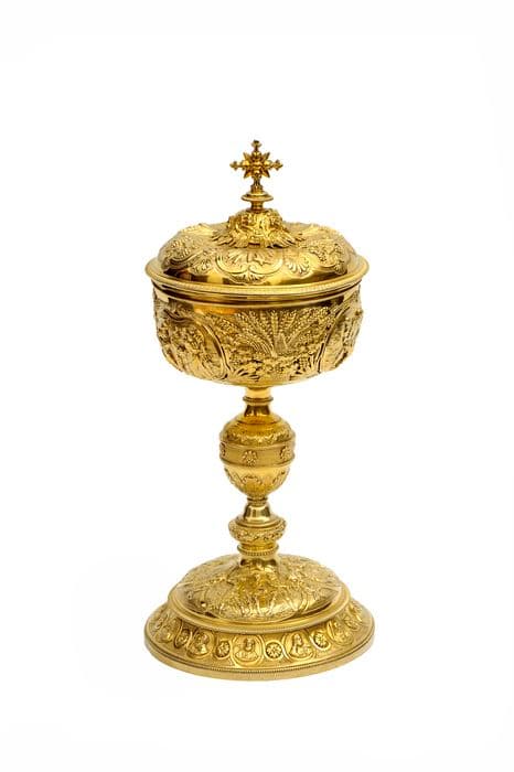 Pied circulaire légèrement bombé ; noeud ovoïde ; couvercle bombé.