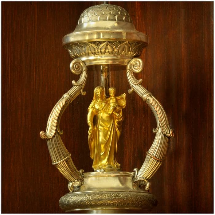 La hampe, après un premier renflement, se termine par une sorte de vase à l'antique. Celui-ci sert de support à un petit édicule fait de trois volutes supportant un dôme. A l'intérieur de ce ciborium, se trouve soit une croix, soit une statuette en métal doré.