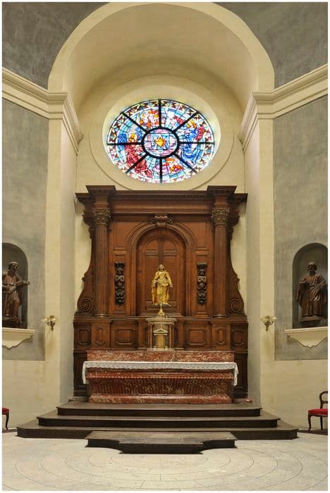 Autel, tabernacle et gradin d'autel en marbre, retable et degrés d'autel en bois. L'autel de marbre rouge de forme galbée à décor de strigiles en façade. Tabernacle circulaire de marbre gris, flanqué de quatre colonnes de marbre rouge avec porte cintré en bois doré avec motif en léger relief surmontée d'un petit fronton triangulaire de marbre noir et de marbre blanc, soutenu par deux colonnes engagées de marbre noir, entablement de marbre blanc. Retable en bois mouluré, flanqué de deux colonnes de style corinthien supportant un entablement et accolades sur les côtés. De part et d'autre de la niche centrale, deux figures rapportées en bas-relief.