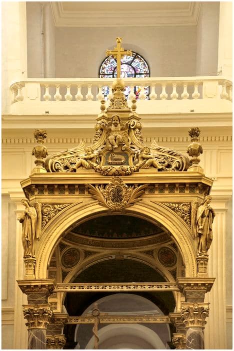 Baldaquin composé de quatre colonnes soutenant une coupole sur pendentif dont les écoinçons intérieurs sont ornés de médaillons circulaires. Surmontant les quatre colonnes, dans les angles, des statues dorées en ronde-bosse.
