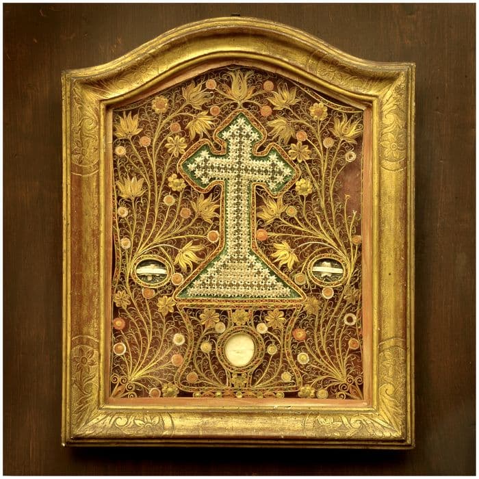 Tableau-reliquaire à paperoles dans un cadre en bois doré dont l'apprêt est gravé Il est de forme rectangulaire, légèrement cintré dans le haut.