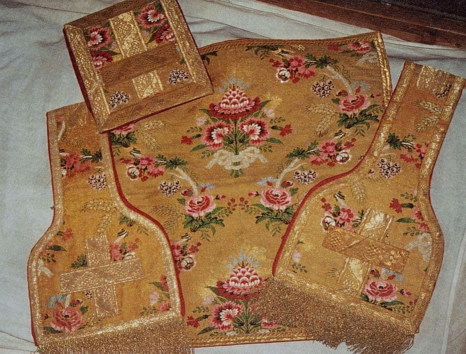 ornement liturgique catholique ; chape ; chasuble (2) ; dalmatique (2) ; étole de clerc (2) ; voile de calice (2) ; manipule (2)