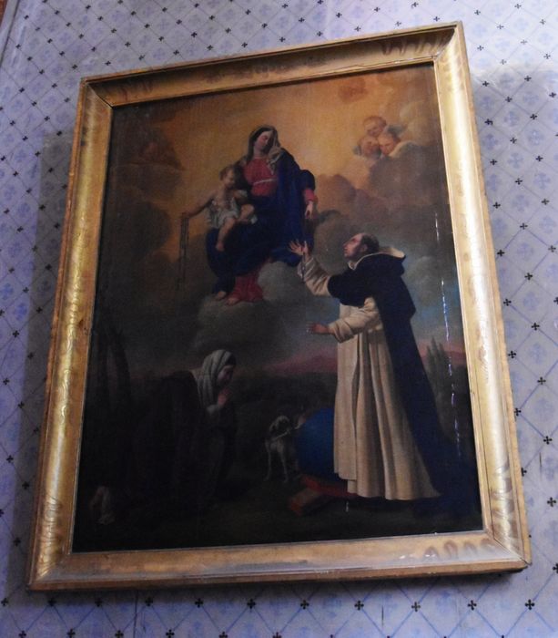 En bas à gauche, sur un fond de paysage, une femme vêtue d'un manteau violet en prière et un chien tenant une torche se tiennent devant saint Dominique. Il porte dans sa main droite un rosaire donné par la Vierge assise avec l'Enfant Jésus sur ses genoux au sein d'une nuée et entourée d'angelots.