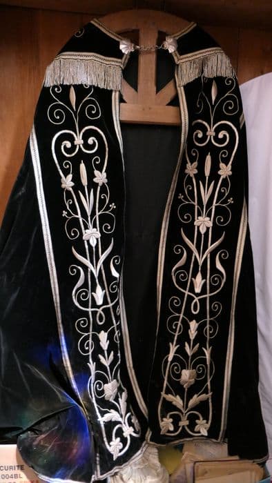 La chasuble est ornée d'épis de blé, d'une croix, et de bouquets de fleurs liées par un noeud.