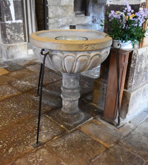 La vasque du bénitier est sculptée en godrons et est supportée par une colonne baguée.