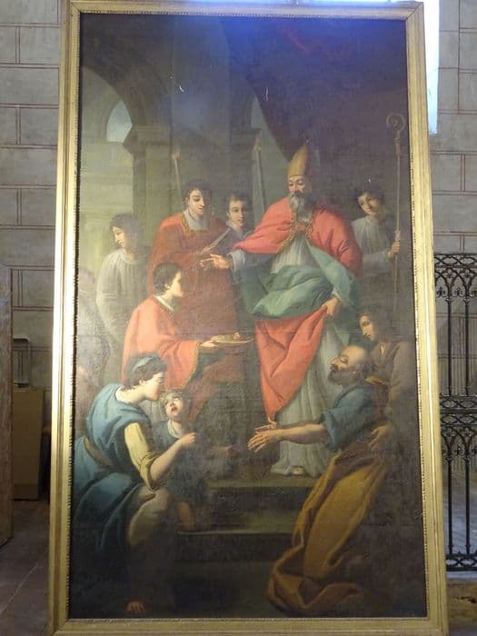 Le sujet représenté semble être saint Clair d’Aquitaine, évêque d’Albi, qui guérit des aveugles.