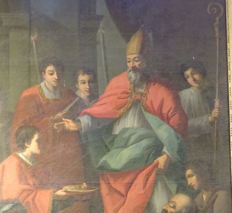 Ce tableau représente un évêque en pied, barbu, portant la mitre, qui bénit un plateau rempli d’eau, présenté par un diacre, vêtu d’une
