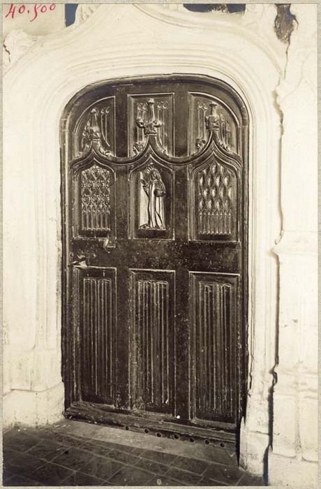 La porte est divisée en deux parties égales en hauteur. La partie du bas est en trois panneaux renfermant une serviette repliée. La partie du haut est également divisée en trois panneaux reliés par une architecture flamboyante en forme de frontons. Dans le panneau du milieu est une niche occupée par le Christ bénissant.
