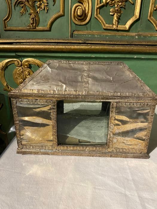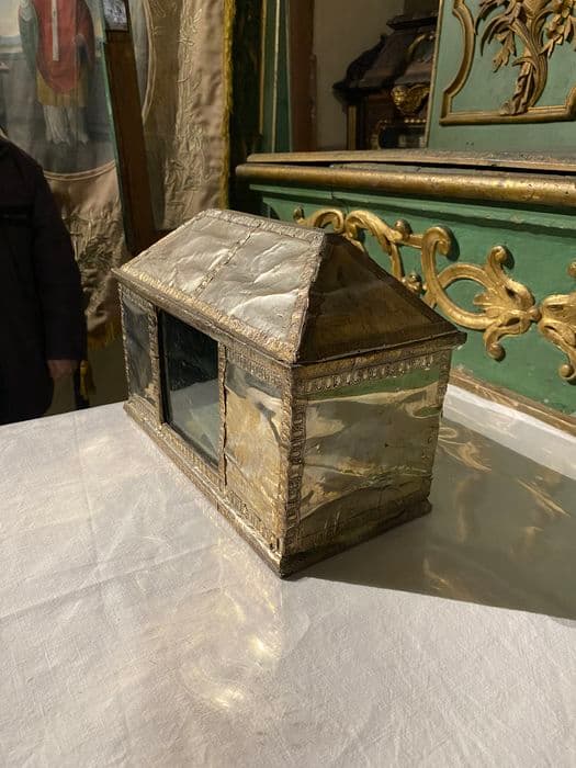 En forme de maison couverte d'un toit à quatre pans. Ame de bois recouverte de plaques d'argent unies, bordée d'une bande décorative estampée. Les deux côtés principaux de la caisse sont percés d'une ouverture carrée d'origine permettant de voir les reliques à l'intérieur.