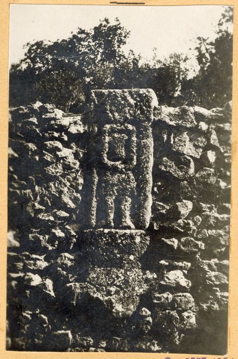 La face antérieure est ornée d'un personnage. La face postérieure porte une croix et au-dessous une décoration de cercles inscrits dans des losanges. La partie supérieure est creusée d'une cavité destinée à recevoir la partie prenante d'un linteau. Selon le professeur Coupry ce monolithe avait un pendant et sur ces deux piédroits était posé un linteau. Et selon F. Benoît, il s'agirait d'un piédroit d'autel provenant du sanctuaire de Saint-Sumian.