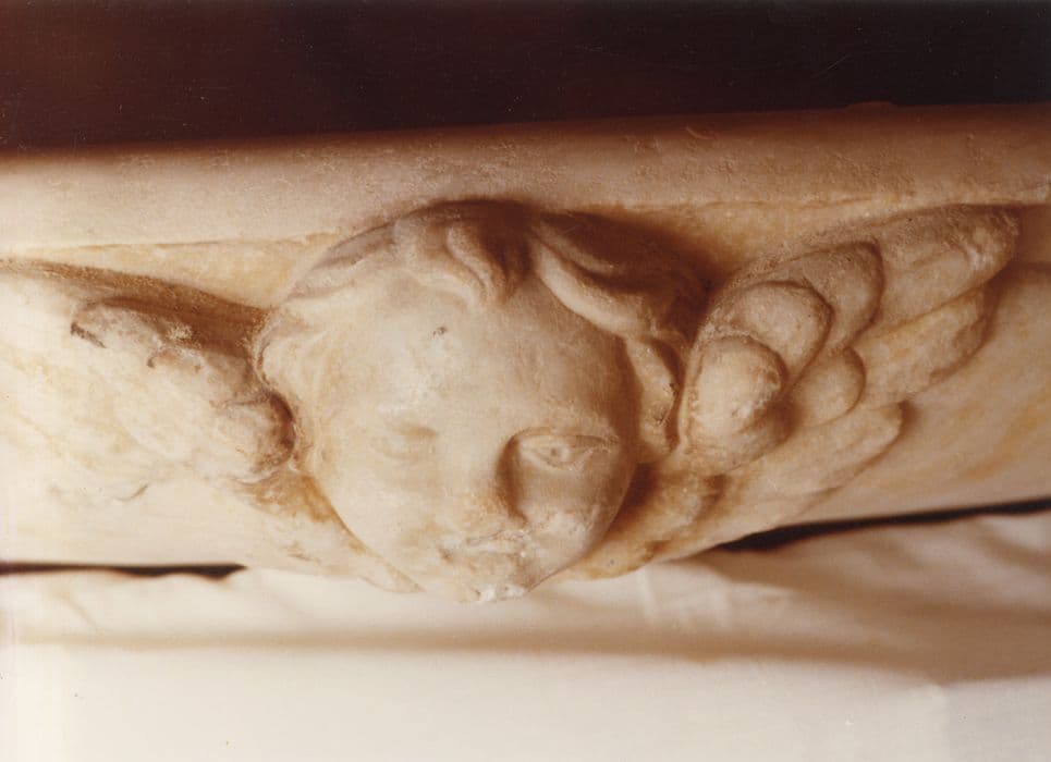 Le renflement de la vasque est orné de quatre têtes d'anges. Quatre pieds en fer maintiennent l'équilibre de cette vasque.