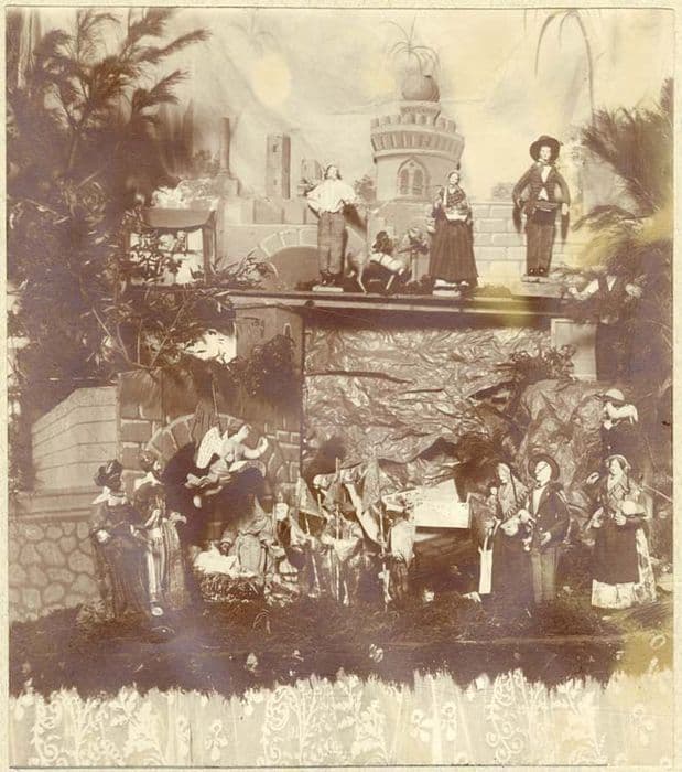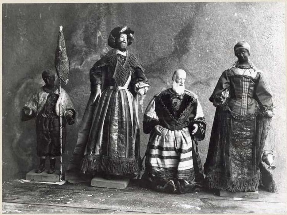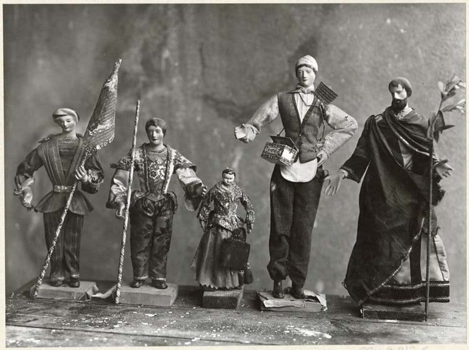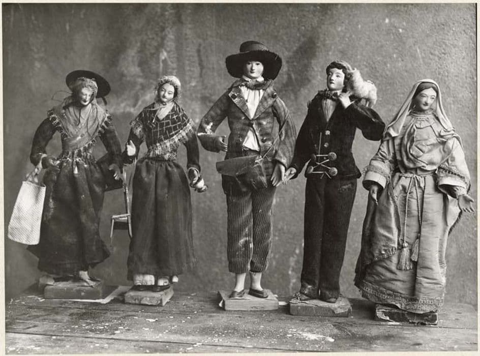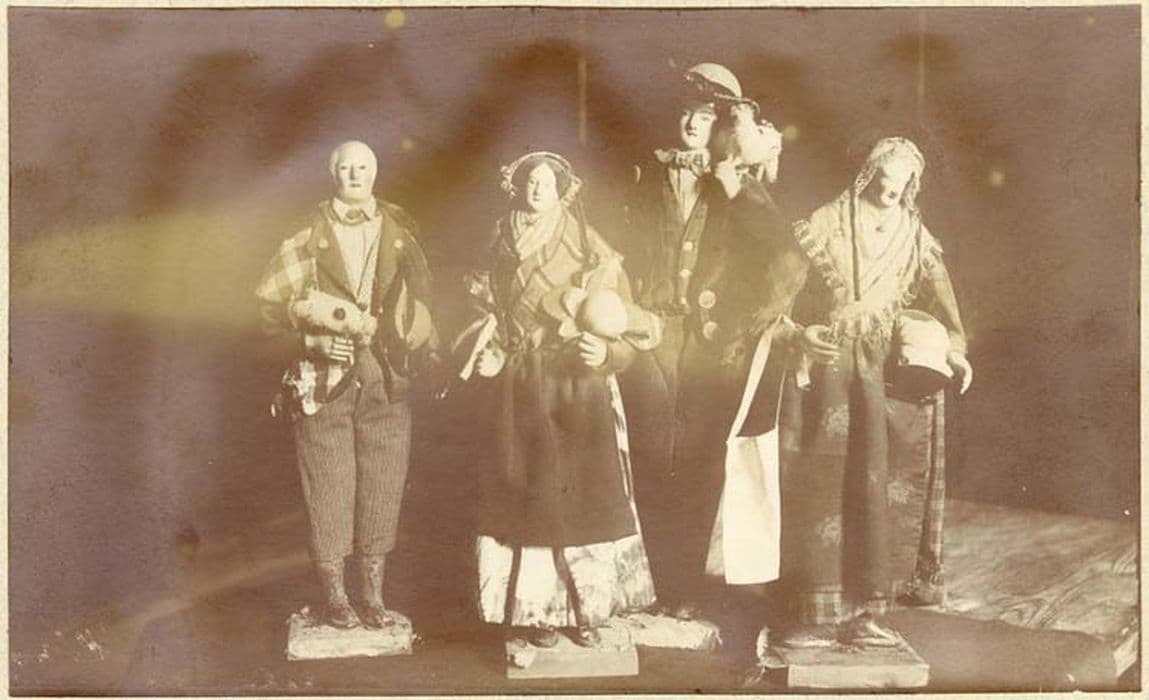 Santons ornant une crèche, en bois polychrome et habits de tissus.