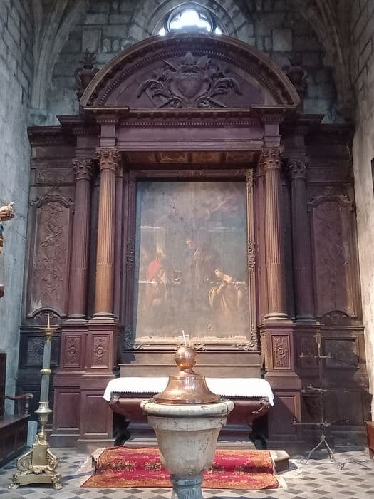 Le retable est composé de quatre colonnes corinthiennes cannelées, supportant l'entablement couronné par un fronton circulaire dont le tympan porte en relief, les insignes épiscopaux. Sur les panoplies qui sont à droite et à gauche des colonnes sont, en demi-relief, également des insignes épiscopaux.