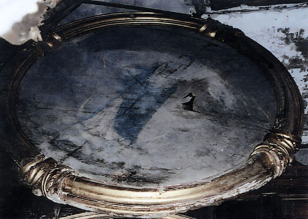 Huile sur toile circulaire représentant la Vierge de l'Immaculée Conception, debout sur un croissant de lune.