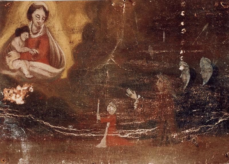 POP | Plateforme ouverte du patrimoineex-voto 19 : Quatre personnages en action de grâce, dont le plus jeune offre un cierge à la Vierge à l'enfant