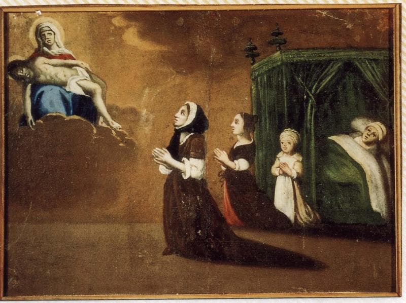 ex-voto 45 : Guérison d'un malade alité. Deux femmes et une fillette en prière devant Notre-Dame-de-Pitié