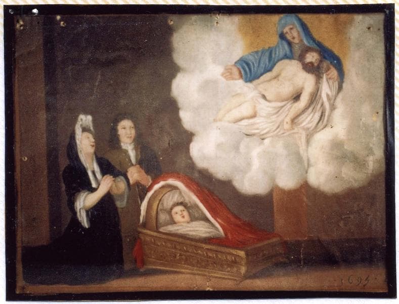 ex-voto 65 : Guérison d'un enfant dans un berceau. Remerciement du couple à Notre-Dame-de-Pitié