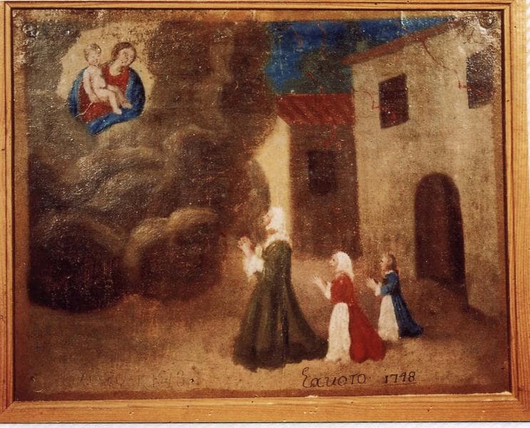 ex-voto 88 avec cadre : Protection obtenue contre un incendie. Femme et deux jeunes filles en prière devant la Vierge à l'Enfant
