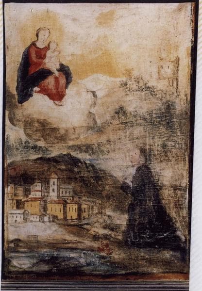 POP | Plateforme ouverte du patrimoineex-voto 98 : Voeu d'un pasteur à genou devant sa cité et face à la Vierge à l'Enfant