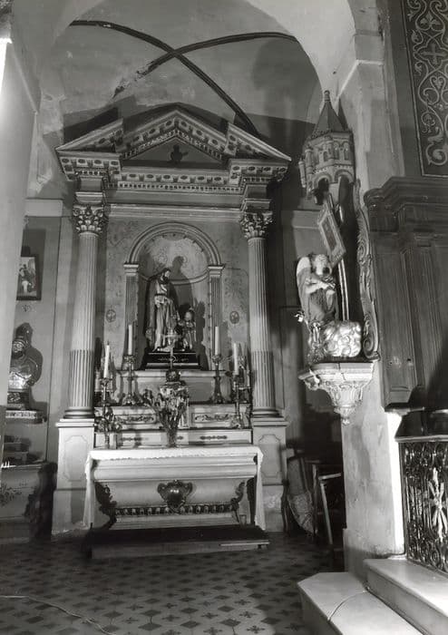Retable à deux colonnes cannelées et rudentées, soutenant un fronton triangulaire à décrochement. L'autel-tombeau, aux formes chantournées, est surmonté d'une niche en plein-cintre, à même le mur.