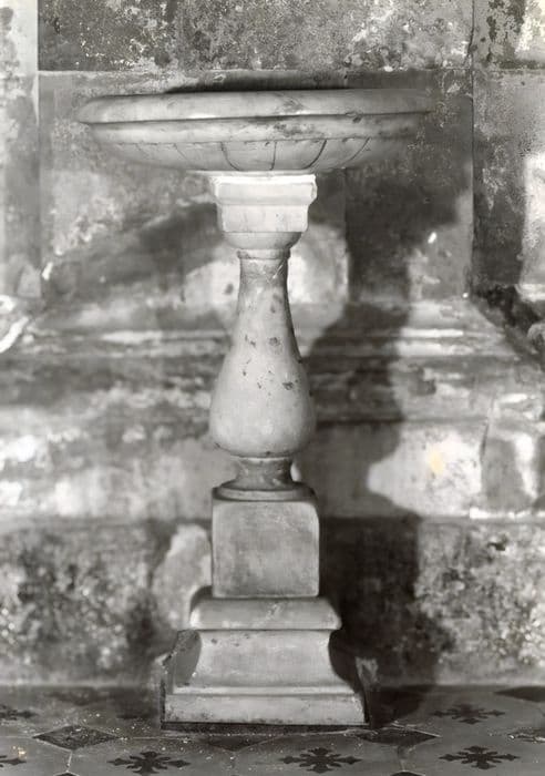 Bénitier de marbre blanc, à socle quadrangulaire, fût en balustre et cuve circulaire à redents.