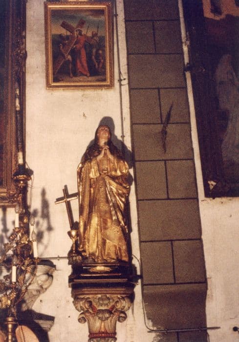 La sainte, debout, a les mains jointes et lève son visage au ciel. Elle porte un vêtement brodé.