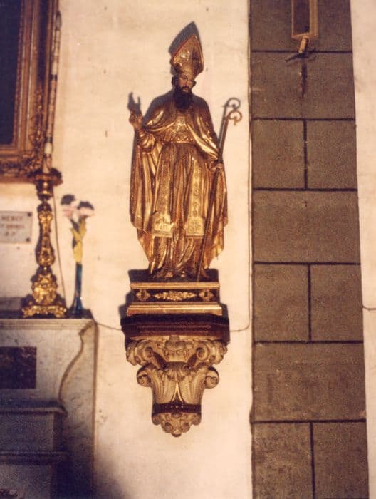 Saint barbu, portant mitre et crosse. Ses vêtements sont dorés.