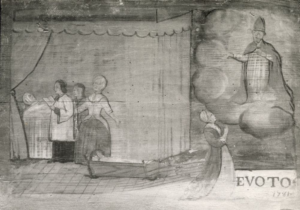 ex-voto : Quatre personnages dont un prêtre dans une chambre devant un lit à baldaquin