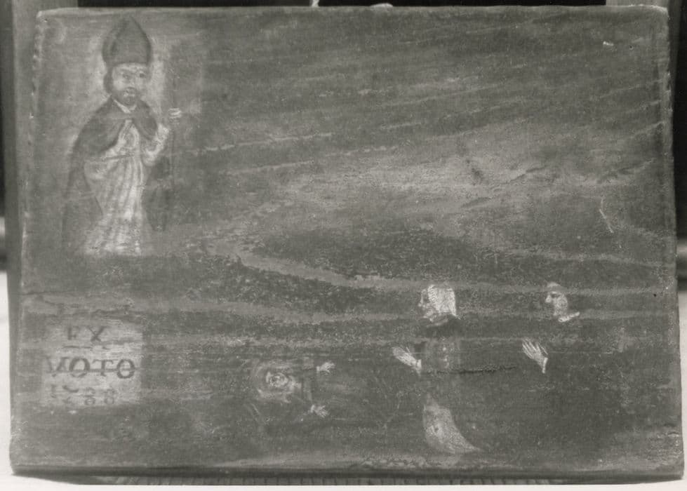 POP | Plateforme ouverte du patrimoineex-voto : Deux personnages agenouillés devant un berceau