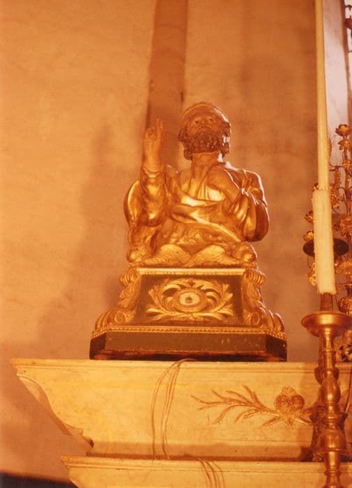 Le saint tend sa main droite dans un geste de bénédiction. Son buste repose sur un socle dont le sommet est orné de têtes d'angelots ailés.