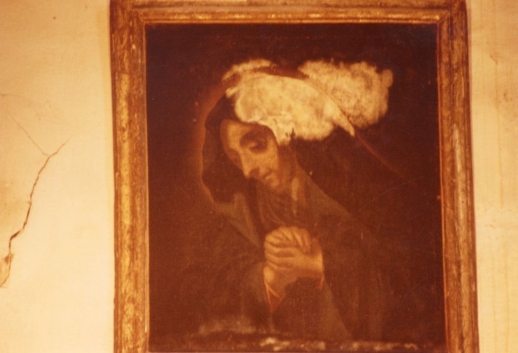 La Vierge, en buste, se penche vers sa droite et a les deux mains jointes.