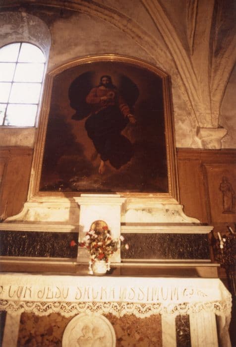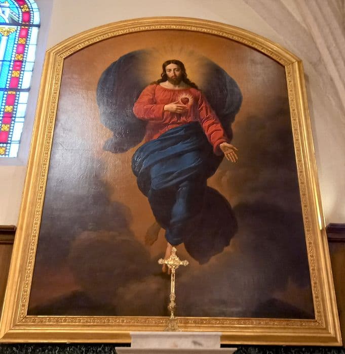Le Christ, dans le ciel, porte la main à son torse sur lequel est représenté le Sacré Coeur.