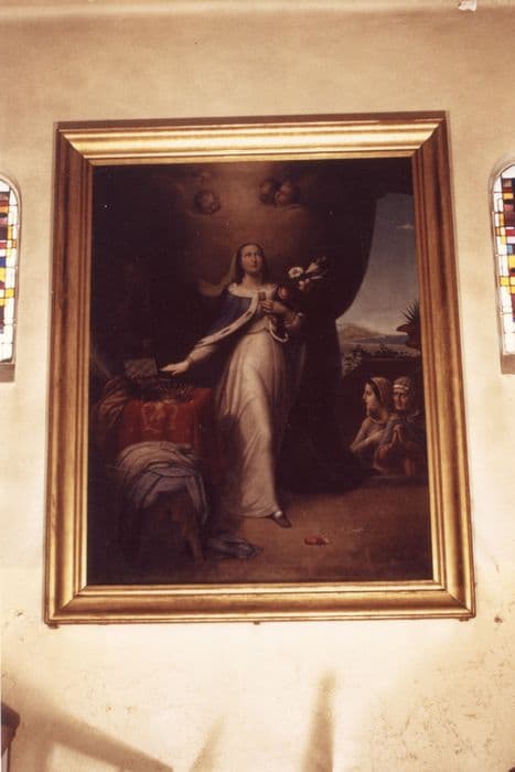 La sainte, debout à côté d'une table sur laquelle est déposée une couronne, tient un bouquet de fleurs. Elle porte son regard au ciel, tandis que deux personnages observent la scène.