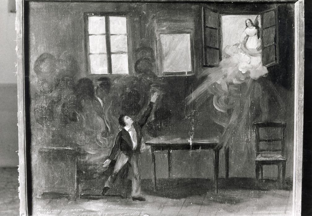Un homme échappe à un intérieur enflammé. Sainte Christine apparaît par la fenêtre.