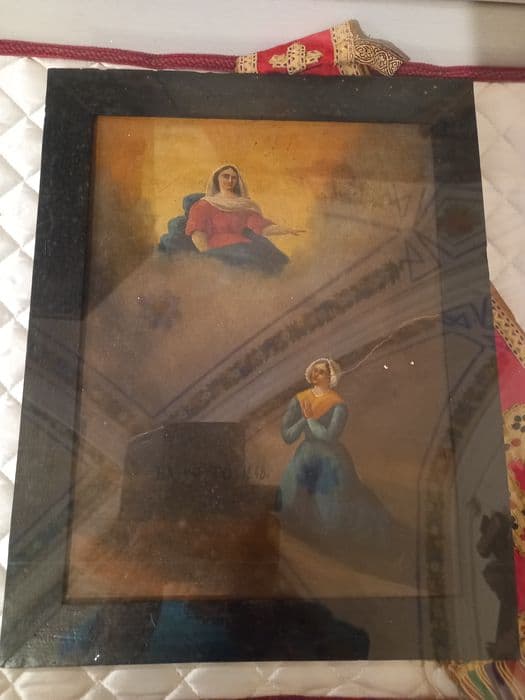 Une femme, agenouillée, prie la Vierge qui apparaît dans le ciel.